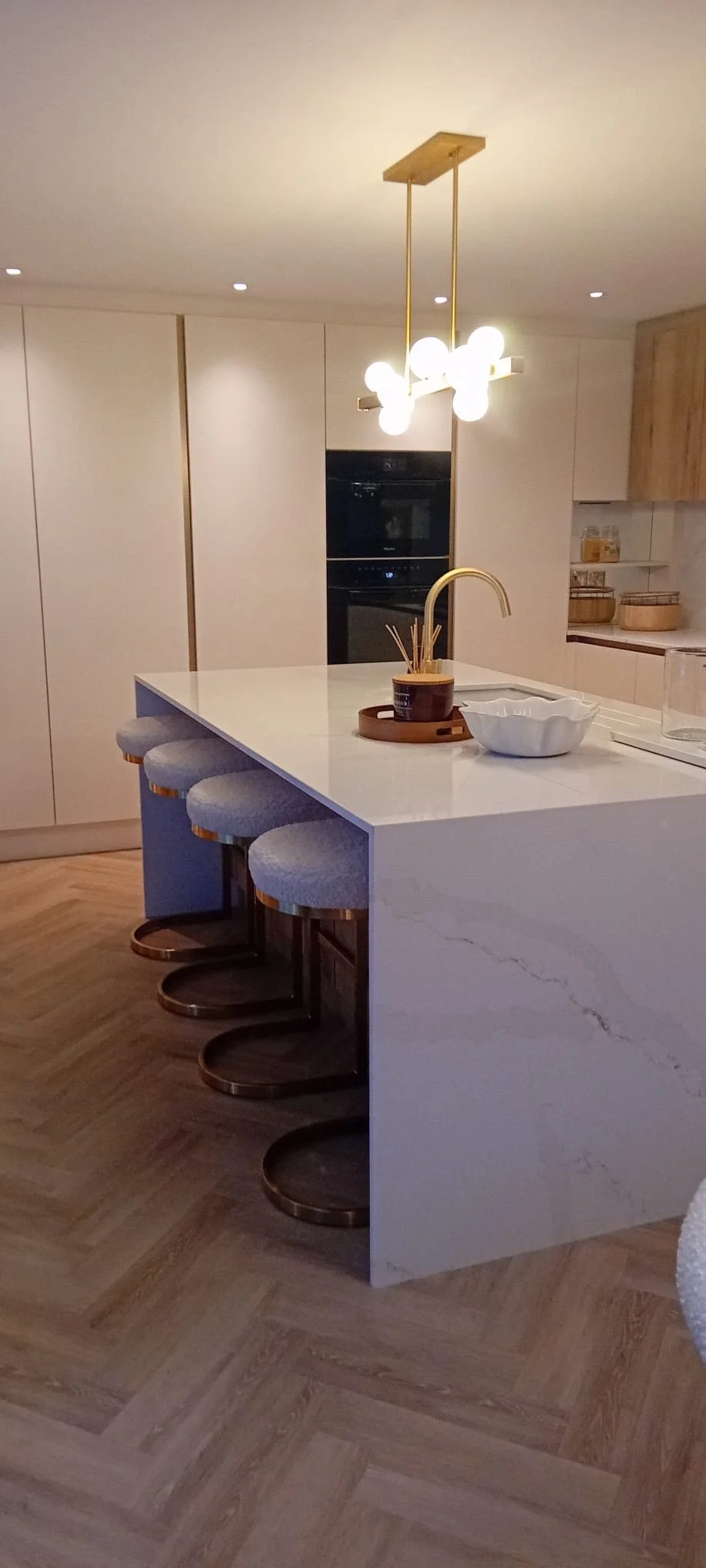 The kitchen became the heart of the home, designed with both style and practicality in mind. A neutral modern aesthetic was achieved using light stone countertops and subtle cabinetry in a soft dove-grey hue, complemented by silver hardware for contrast. Integrated appliances and generous storage ensured the space remained clutter-free and easy to use, making it perfect for both daily life and entertaining.